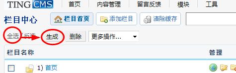 “栏目中心”,按照下面的图示,先点全选,再点生成,刷新下你修改的那个栏目或文章就可以了,如果只是想见到修改后的某一篇文章或产品页面有没效果,修改完后,刷新下你的文章或产品页就行,文章或产品页在修改后就已经自动生成了。